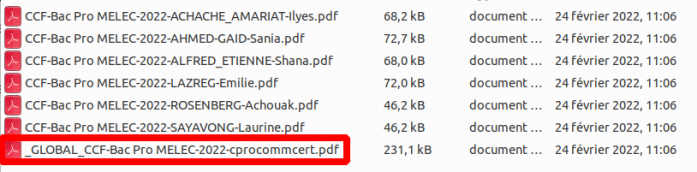 Si vous souhaitez imprimer les grilles de tous les candidats, il est préférable de choisir le dernier bouton “EXPORTER LA DIVISION (FORMAT PDF)”. Dans l'archive proposée, en plus d'un fichier par apprenant, vous trouverez un fichier dont le nom commence par _GLOBAL. Ce fichier contient toutes les grilles de tous les élèves sélectionnés. Ce format peut donc s’avérer utile pour une impression globale de tous les dossiers.