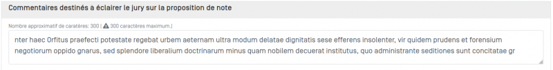 Ces commentaires seront présents sur les documents exportés et serviront à éclairer le jury pour l'épreuve considérée. Il s'agit d'un texte simple, sans mise en forme, qui sera tronqué au delà de 300 caractères. Vous disposez d'un compteur vous indiquant le nombre de caractères saisis.