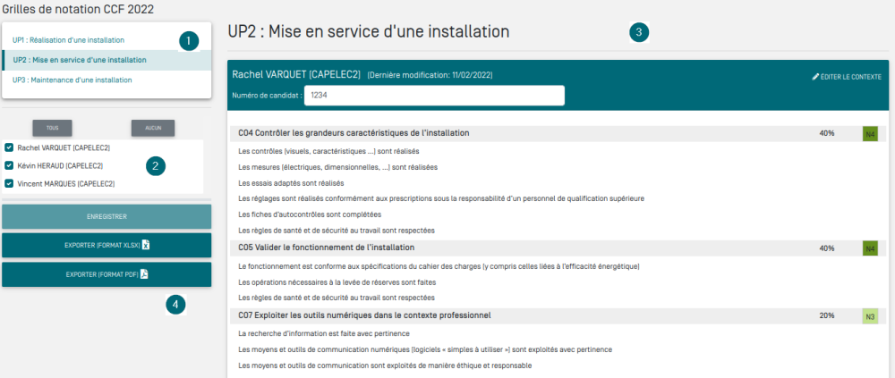 Ce module, destiné au profil Enseignant du CAP Électricien.ne, permet l'édition des grilles de notation CCF UP1, UP2 et UP3. Les grilles intégrées dans CPRO sont conformes aux grilles d'évaluation nationales, elles intègrent en autres le barème définit par le Ministère de l'éducation nationale. Ce module permet à l'enseignant de compléter les grilles de notation CCF directement dans CPRO puis de les exporter au format .XLSX et/ou PDF pour archivage.