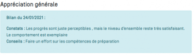 Afin d'éclairer le contenu de l'appréciation générale, vous disposez de tous les constats et conseils saisis dans les différents bilans remontant dans l'interface LSL Pro. Ces informations sont présentées par bilan et sur fond bleu.