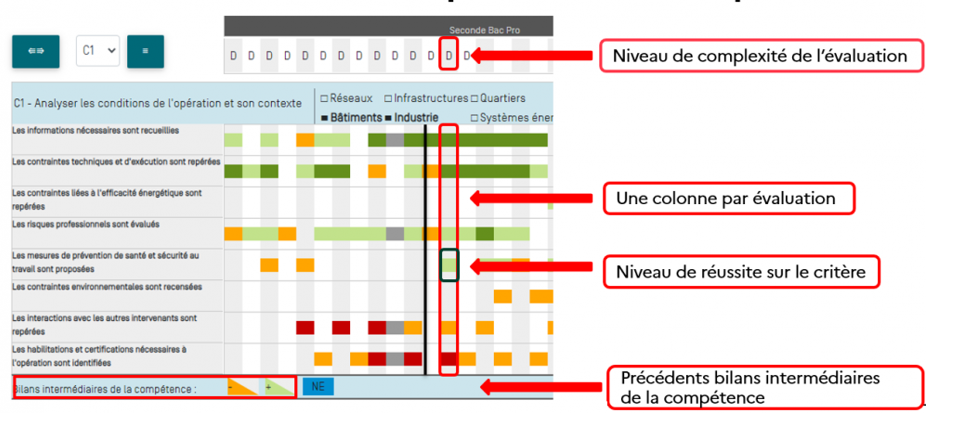 Pour chaque compétence, on affiche l'ensemble des résultats d'évaluation sur les différents critères en utilisant une colonne pour chaque évaluation.