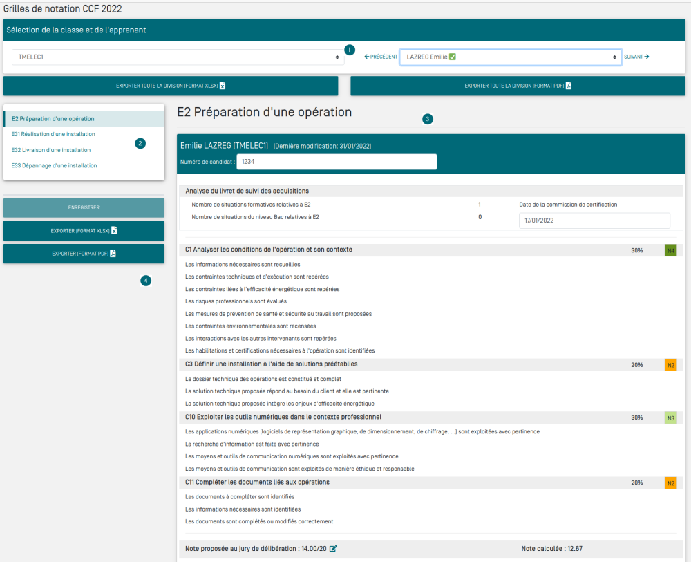 Cadre d'enregistrement des saisies et d'export des grilles de notation CCF au format XLSX et PDF