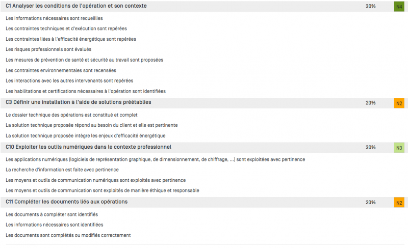 Le pourcentage à gauche de l'indicateur coloré rappelle le barème de la compétence pris en compte dans le calcul de la note. Ce barème est fournit par le Ministère.