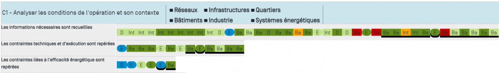 En haut à gauche, on retrouve le code et l'intitulé complet de la compétence. En haut à droite, sont affichés les six secteurs d'activité définis dans le référentiel. Quand un secteur n'a pas été abordé, la case reste vide. Les secteurs ayant été abordés au moins une fois dans les évaluations réalisées sur un des critères de cette compétence apparaissent en gras, et la case à gauche de leur nom est noircie.