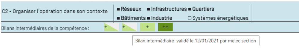 Quand le niveau de la compétence a été sélectionné, le rectangle coloré qui le représente remplace le rectangle bleu sur la ligne “Bilans intermédiaires de la compétence”.