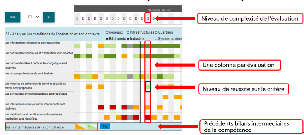 Pour chacun des critères d'évaluation de la compétence, on retrouve l'indication du niveau atteint par l'apprenant avec le repérage coloré graduel mis en place :