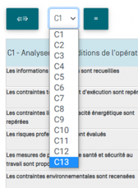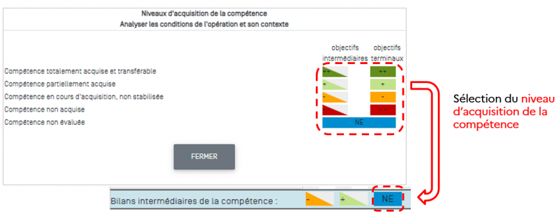 Un clic sur le rectangle bleu ouvre dans le haut de page la fenêtre de saisie du positionnement de l'apprenant sur la compétence à évaluer (son nom est rappelé en deuxième ligne de titre ; dans notre exemple : Analyser les conditions de l'opération et son contexte“) : le niveau d’acquisition exigé en Première Bac Pro n’étant pas forcément celui qui est attendu en fin de formation, le professeur va pouvoir moduler ses évaluations en se référant soit des objectifs intermédiaires à atteindre en cours de formation, soit à des objectifs de fin de formation.