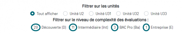 Un second filtre permet de filtrer l'affichage sur le niveau de complexité des évaluations que l'on souhaite afficher (Découverte (D), Intermédiaire (I), niveau Bac Pro (Ba), en entreprise (E)) :