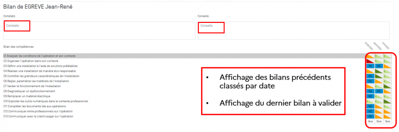 - le bouton “Enregistrer” confirme la création du bilan et l'enregistrement des saisies (exemple : saisie d'un conseil), le bilan pourra être modifié par la suite, il n'est pour l'instant pas visible par l'apprenant.