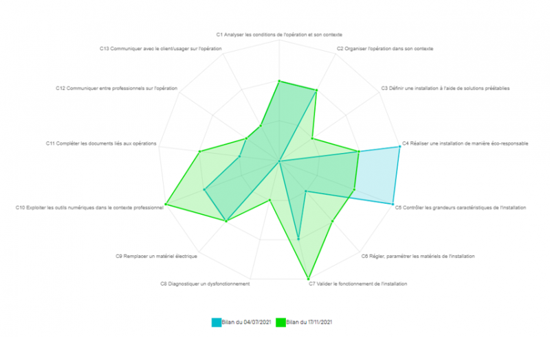 Un diagramme radar permet de visualiser de façon graphique le positionnement de l'apprenant sur ses deux derniers bilans intermédiaires.
