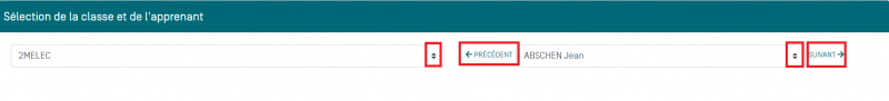 En haut de la page, deux listes déroulantes permettent de sélectionner l'apprenant.