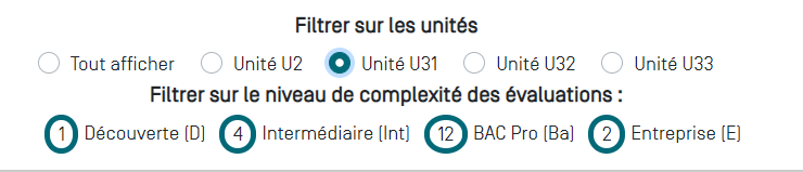 Un second filtre permet de filtrer l'affichage sur le niveau de complexité des évaluations que l'on souhaite afficher (Découverte (D), Intermédiaire (I), niveau Bac Pro (Ba), en entreprise (E)) :