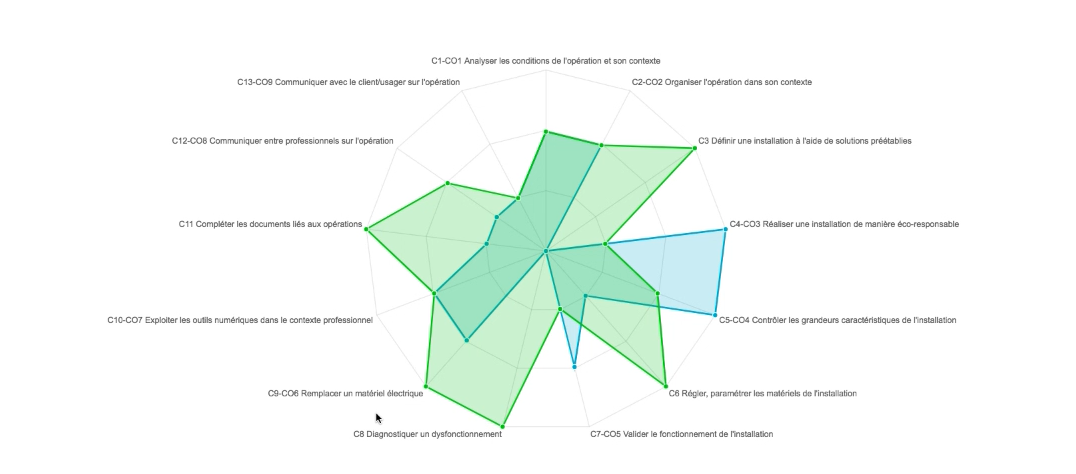 À partir de l’analyse des données présentées dans le tableau de bord, il est possible de positionner l'apprenant sur les différentes compétences pour créer un bilan intermédiaire de compétences.