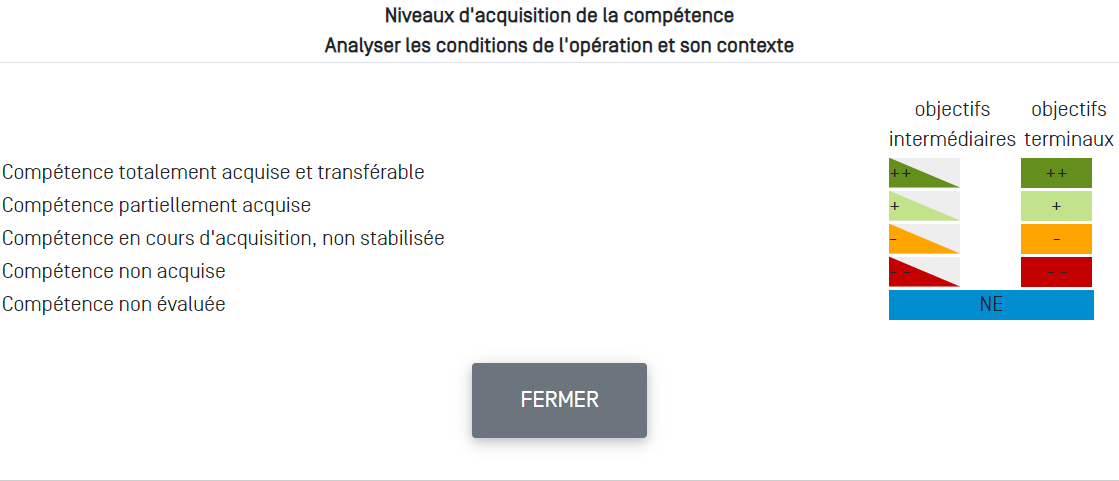 Pour chacun des critères d'évaluation de la compétence, on retrouve l'indication du niveau atteint par l'apprenant avec le repérage coloré graduel mis en place :