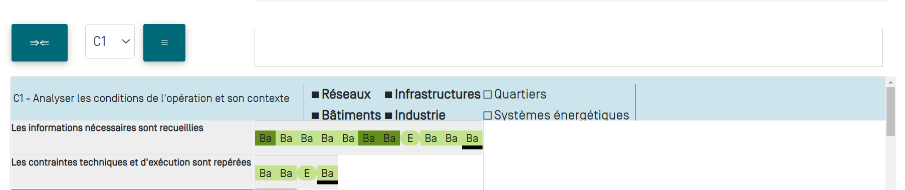 Note: Les secteurs ayant été abordés au moins une fois dans les évaluations réalisées sur un des critères de cette compétence apparaissent en gras, et la case à gauche de leur nom est noircie.