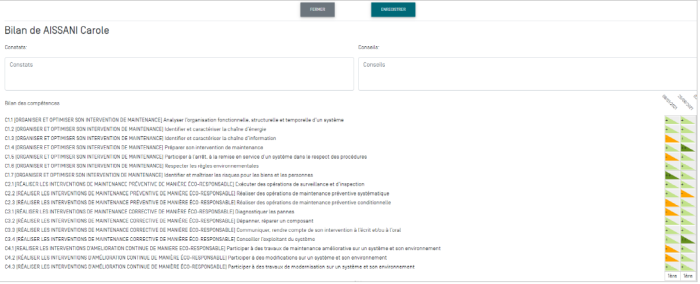 Les champs “Constats” et “Conseils” vous permettent de renseigner des informations complémentaires destinées à éclairer le bilan. Elles sont visibles par l'apprenant.