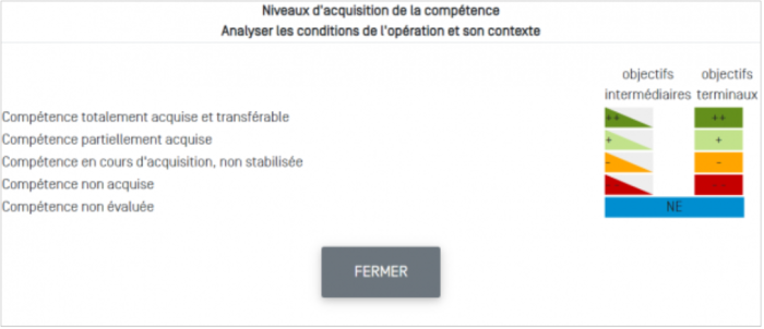 la fenêtre de saisie du positionnement de la compétence s'ouvre en haut de votre écran. Vous pouvez ainsi évaluer le degré de maitrise de la compétence pour l'apprenant concerné.