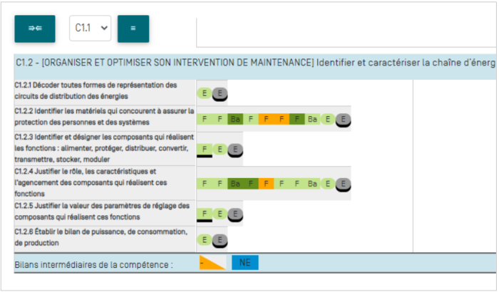 La création d’un bilan intermédiaire de compétences nécessite de positionner l'apprenant sur les compétences qui sont évaluées. Un affichage en mode condensé est possible pour faciliter la lecture et l’analyse.